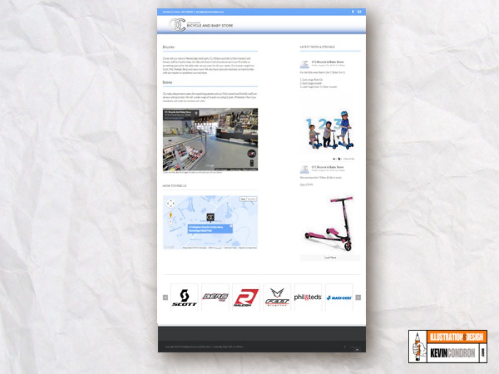 Design a one page web site to market ‘OC Bicycle & Baby Store’. Web site to include a facebook feed, google map and link to a virtual google shop tour.